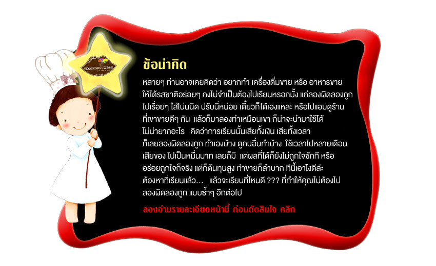 ทั้งนี้เพื่อให้ผู้ประกอบการสามารถนำสูตรที่เรียนไปใช้ได้อย่างมีประสิทธิภาพ ทำอย่างไรให้รสชาติของเราอร่อยลงตัว เทคนิดต่างๆ ที่บางท่านไม่เคยทราบ แต่พอได้เรียนไปแล้ว ก็ได้นำไปใช้ได้อย่างถูกต้อง การเรียนการสอนของ Trainingfresh เน้นให้ผู้เรียนได้ ปฏิบัติ มากกว่าทฤษฎี และ รู้จัก การขายอย่างถูกต้อง รวมไปถึงการต่อยอดผลิตภัณฑ์ ให้มีความหลากหลาย เพื่อให้นักเรียนทุกท่าน ขายได้ดี มีกำไรอย่างงดงาม และทำอย่างไรให้เรามีลูกค้าประจำให้มากที่สุด